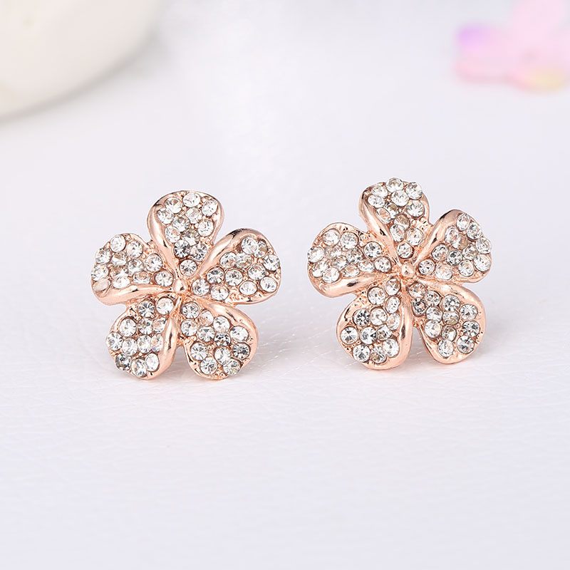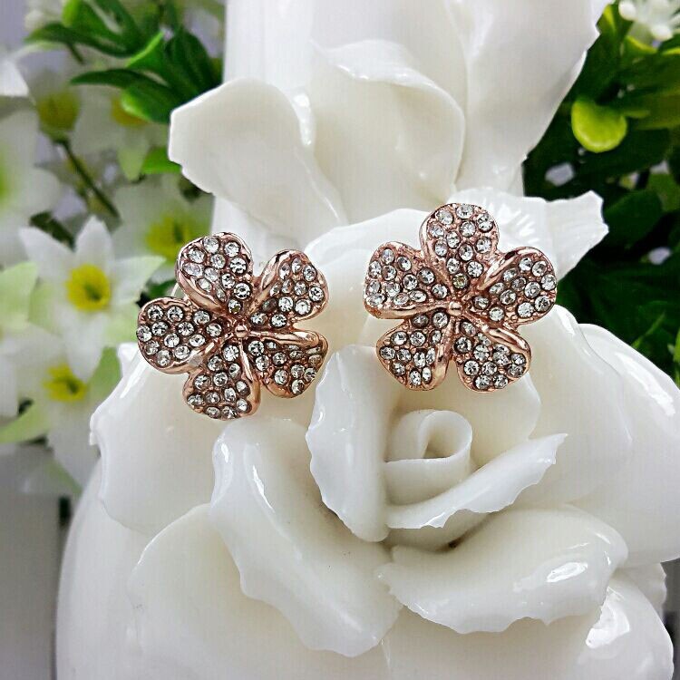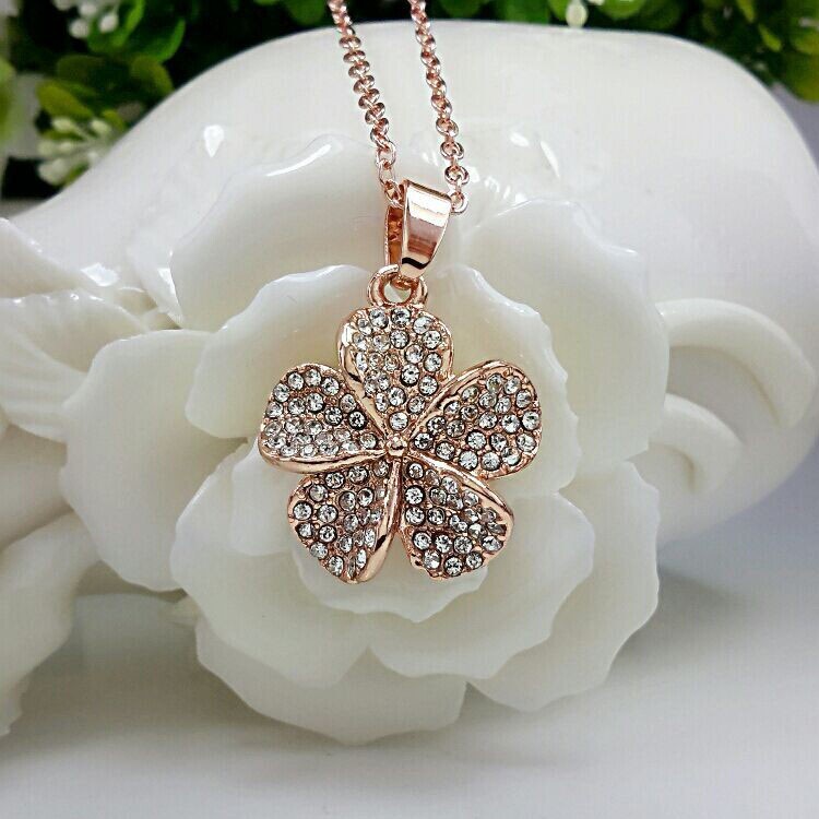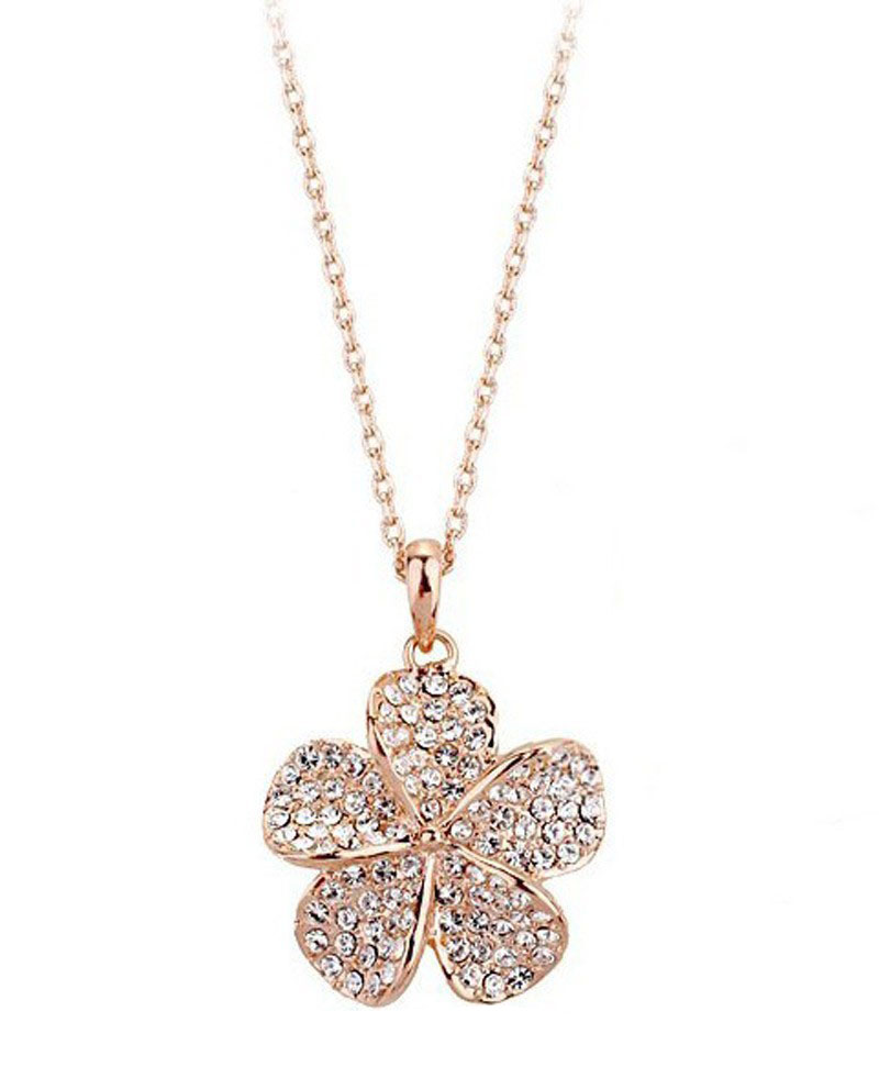 Set molto elegante e femminile composto da una catenina con pendente e un paio di orecchini a forma di fiore con piccoli cristalli austriaci, realizzato in metallo di colore oro.