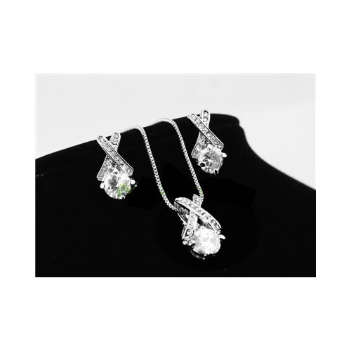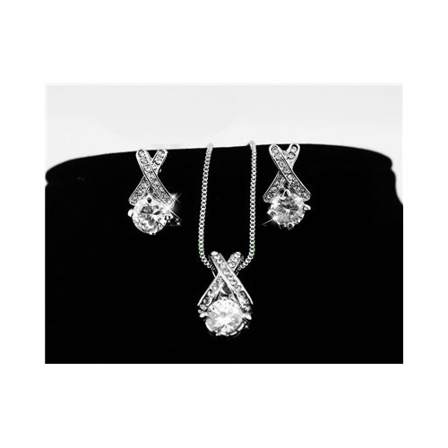 Set molto elegante e femminile composto da una catenina con pendente e un paio di orecchini con cristalli austriaci, realizzato in metallo di colore argento.