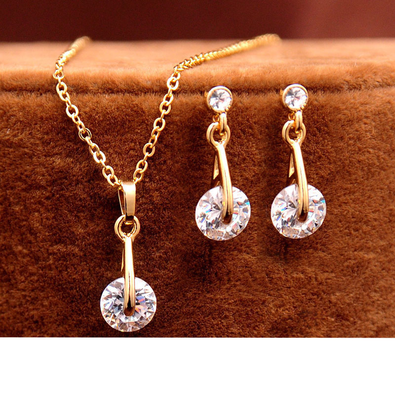 Set molto elegante e femminile composto da una catenina con pendente e un paio di orecchini con cristalli austriaci, realizzato in metallo di colore oro.
