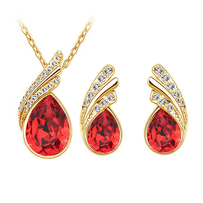 Set molto elegante e femminile composto da una catenina con pendente e un paio di orecchini a forma di goccia dacqua con cristalli austriaci, realizzato in metallo di colore oro.