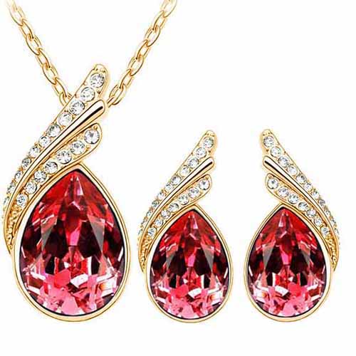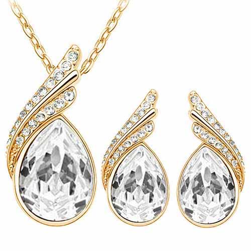 Set molto elegante e femminile composto da una catenina con pendente e un paio di orecchini a forma di goccia dacqua con cristalli austriaci, realizzato in metallo di colore argento o oro.